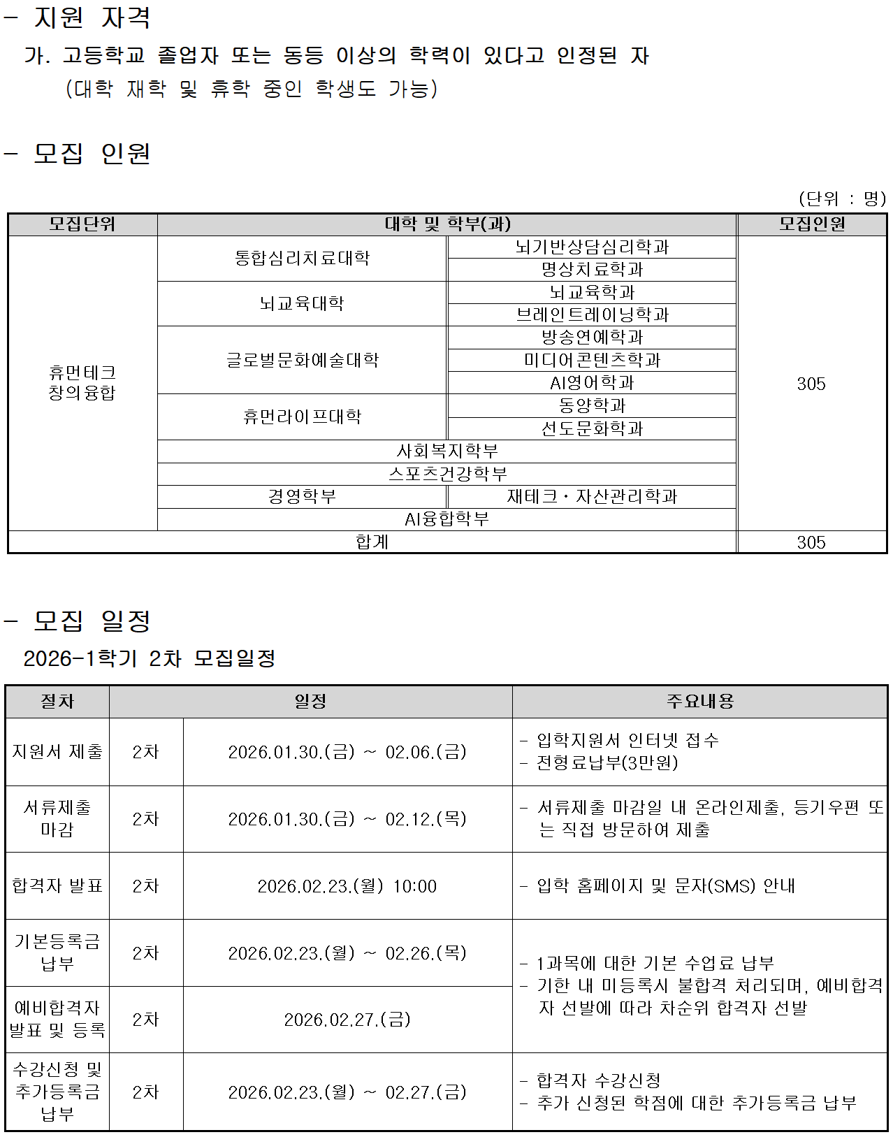 본교의 2026-1학기 2차 시간제등록생 모집을 안내드립니다.